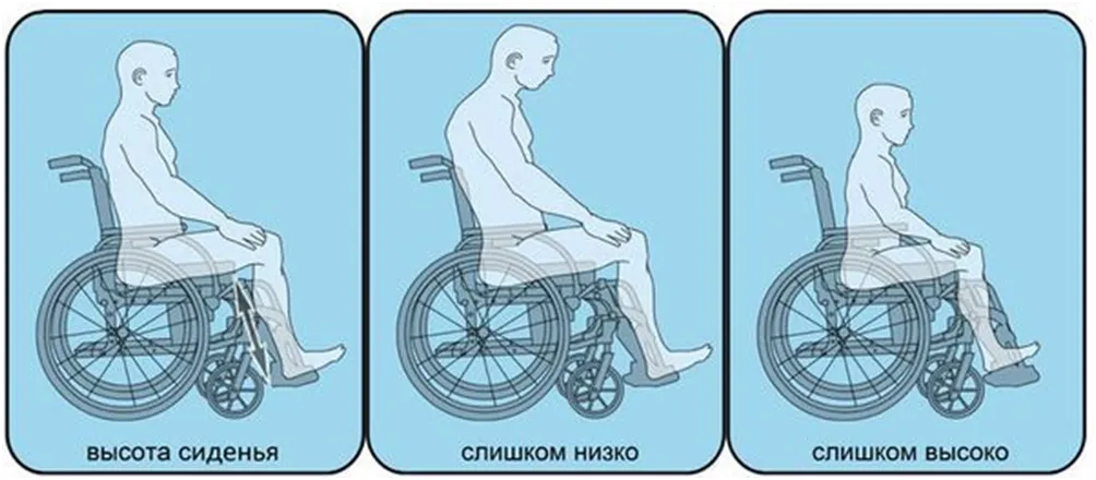 Для того чтобы рассчитать необходимую высоту сидения, нужно измерить длину согнутой в коленном суставе ноги от пятки или каблука, если человек в коляске будет находиться в обуви, до нижнего края бедра. Прибавить к полученному результату 5 см (зазор от пола до подножки) и ½ от высоты противопролежневой или ортопедической подушки, если пациент собирается её использовать. Половина от высоты подушки берётся потому, что под тяжестью собственного веса пользователя её объём уменьшается вдвое. При правильно подобранной высоте сидения находящийся в коляске свободно может подсунуть под бедро указательный палец примерно на 2/3 его длины (это 3,5-5 см).
