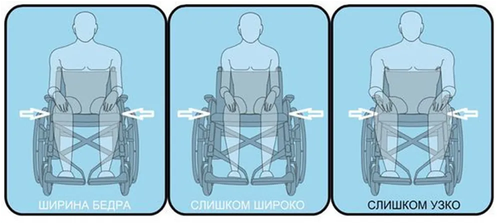 Определение ширины сидения. В среднем величина колеблется от 38 до 56 см (для взрослых пациентов). Ориентиром является комплекция человека, использующего коляску. Для того чтобы подобрать оптимальную ширину, нужно замерять сантиметровой лентой расстояние в самой широкой части бёдер в положении сидя. К полученному результату добавить 5 см, данная прибавка гарантирует правильное положение пациента в кресле. Следует учитывать возможность ношения плотной одежды либо толщину верхней одежды, если пользователь намерен выезжать на прогулки в этой же коляске. По бокам сидящего в коляске человека должны оставаться зазоры, чтобы свободно проходила ребром ладонь, примерно по 2,5 см с каждой стороны.