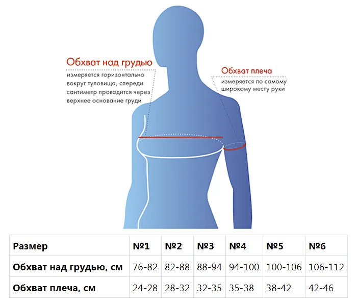 - Застежка Velcro в нижней части изделия позволяет регулировать объём бандажа в зависимости от обхвата плеча
