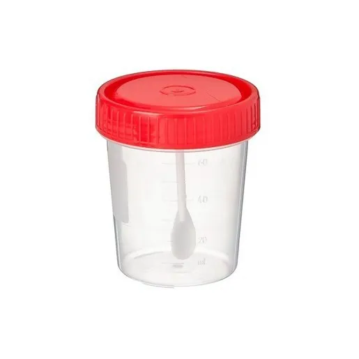 Контейнер для биопроб объемом 60 мл с ложкой стерильный - с завинчивающейся крышкой, ложкой, градуированный, с окошком для записей.
