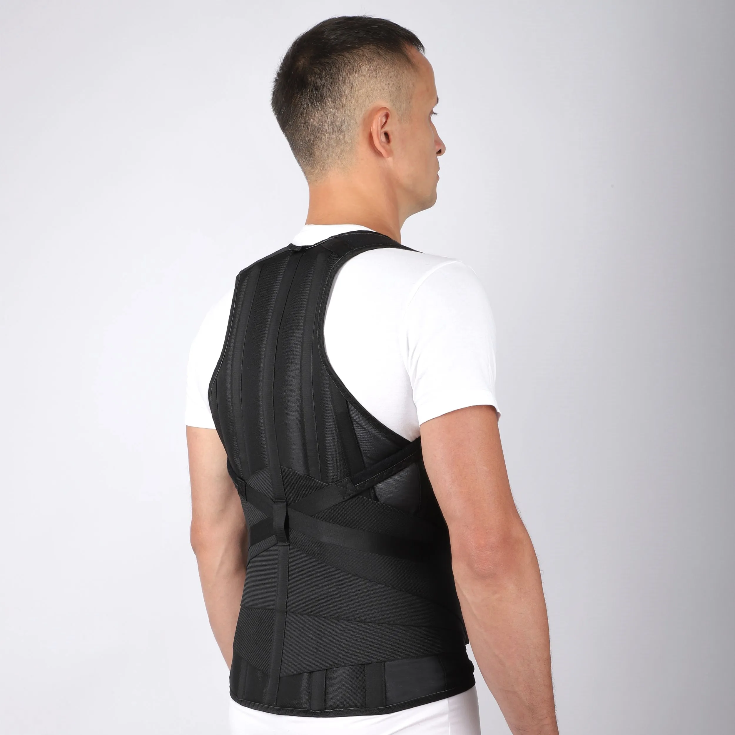 - На спинке 2 съемных металлических моделируемых ребра жесткости вдоль всего ствола позвоночника и 2 несъемных коротких пластиковых ребра жесткости, ребра обеспечивают плотную фиксацию и стабилизацию позвоночника