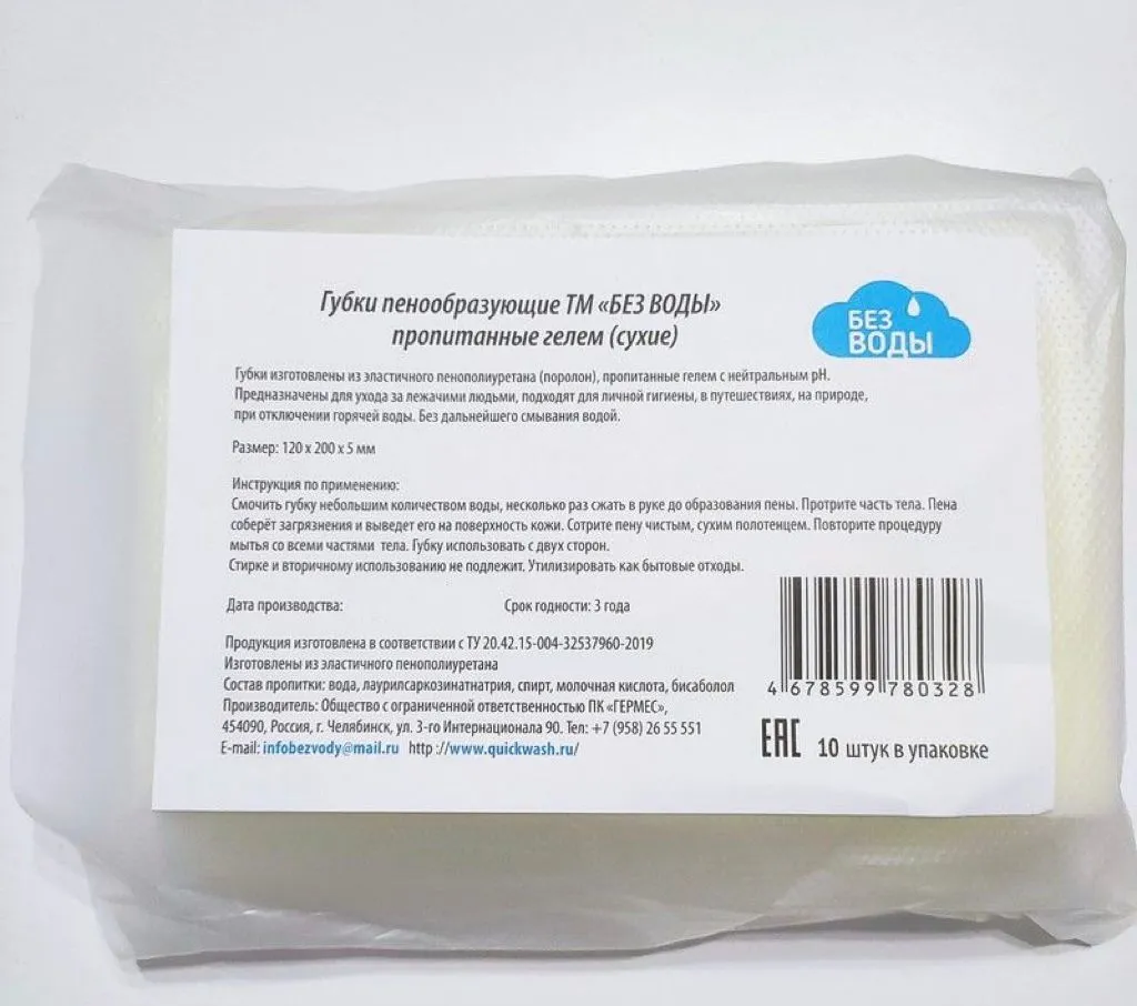 Губки изготовлены из эластичного пенополиуретана (поролон) пропитанные гелем с нейтральным рН. Предназначены для ухода за лежачими людьми, подходят для личной гигиены в путешествиях, на природе, при отключении горячей воды. Без дальнейшего смывания водой.