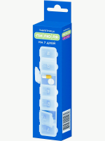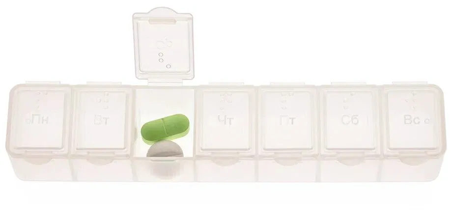 Таблетница содержит 7 отделений, которые соответствуют дням недели: ПН, ВТ, СР, ЧТ, ПТ, СБ и ВС. Для людей с ослабленным зрением нанесена маркировка символами Брайля. подробнее ...