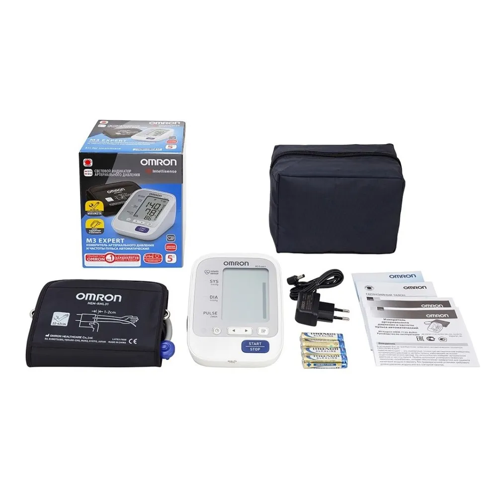 В комплекте с измерителем артериального давления Omron M3 Expert поставляются универсальная веерообразнаяOmron Easy Cuff, модель HEM-RML31, для пользователей с длиной окружности плеча от 22 до 42 см и сетевой мини-адаптер Omron S для питания от бытовой электросети. Прибор также может питаться и от набора батареек, которого, благодаря технологии энергосбережения, хватит примерно на 1000 процедур измерения давления.