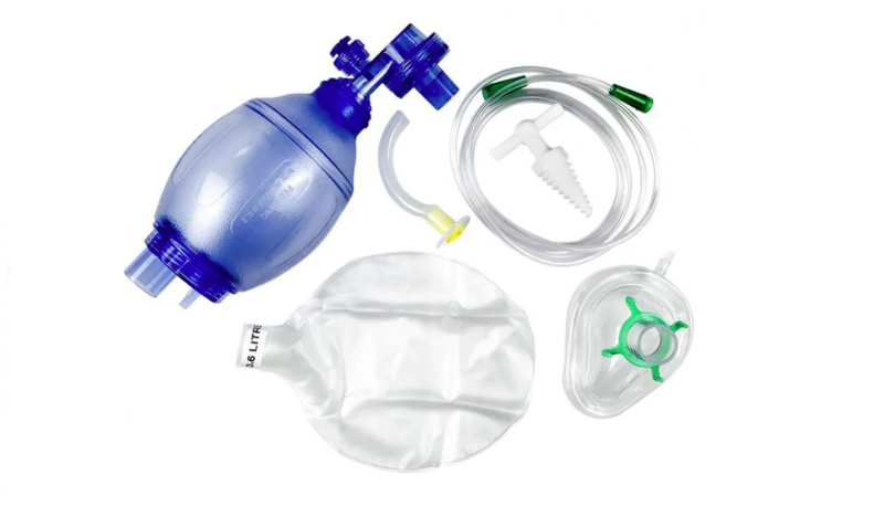 В комплект входят: мешок вентиляционный объемом 1630 мл, резервный 2000 мл, маска дыхательная многоразового применения, трубка полимерная (длиной 2 м), воздуховод (60 мм), роторасширитель, футляр для хранения